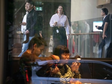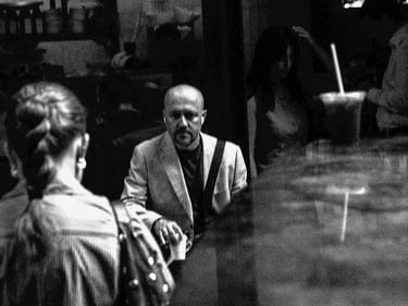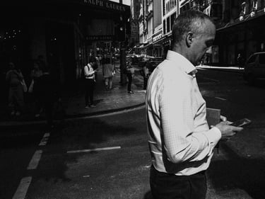 Jonathan Jasberg's primary point in his list of photographic elements is the need for what he calls "supporting characters". These are people who assist the main character in creating a complex street photograph. A quote from ChatGPT is: "A street scene that feels 'alive' often has multiple people interacting in different ways. Supporting characters make a street photograph feel more authentic, as they reflect the true bustle and diversity of urban life".
