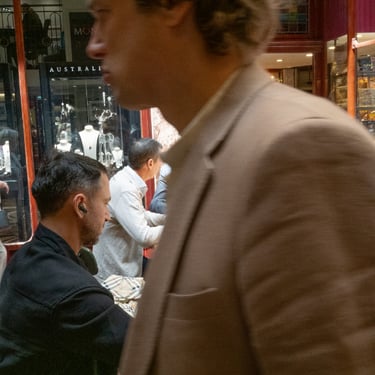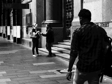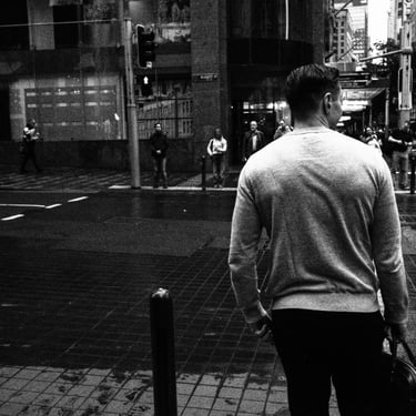Cloud cover for my Sydney street photography provides a diffused light, devoid of the contrasting light and dark. I’m at home in both settings, though sunny conditions are my favourite.